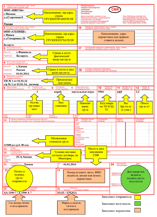 Графы 1-15, 21, 22 CMR-накладной заполняются ОТПРАВИТЕЛЕМ груза. Отправитель несёт материальную ответственность за полноту и достоверность любых сведений, указанных с CMR-накладной.